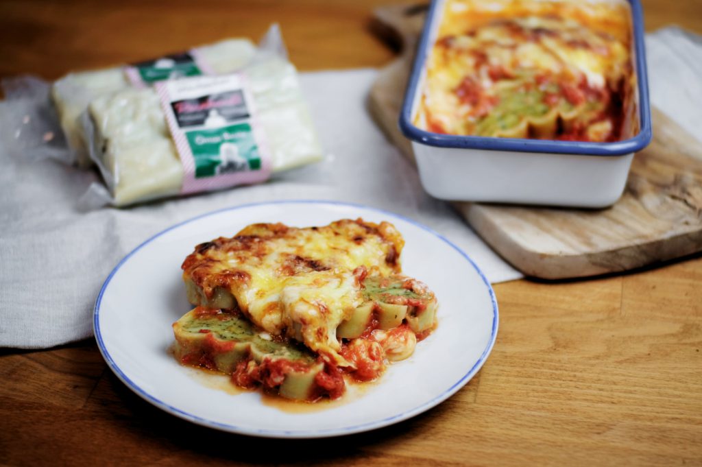 Maultaschen in dünne Scheiben schneiden. Eine ofenfeste Schale abwechselnd mit einer Schicht Maultaschen dann Tomatensoße dann Käse belegen. Die oberste Schicht mit Käse abdecken. Anschließend für 25min in den Backofen geben.